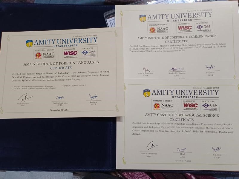 In the journey of lifelong learning, pursuing specialized certifications has always been pivotal. At Amity University, I had the privilege to delve into diverse fields, enhancing my portfolio with certificates that span across Foreign Languages, Communication, and Behavioral Science.